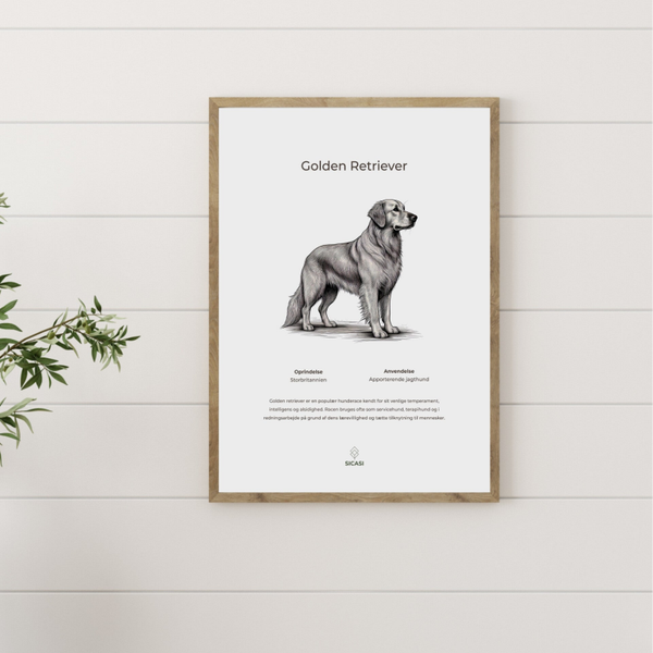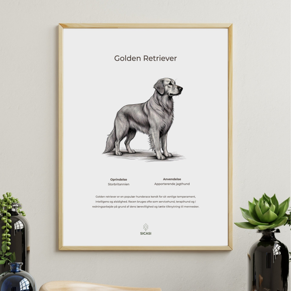 Plakat med hunderacen golden retriever inklusiv fakta og racebeskrivelse.