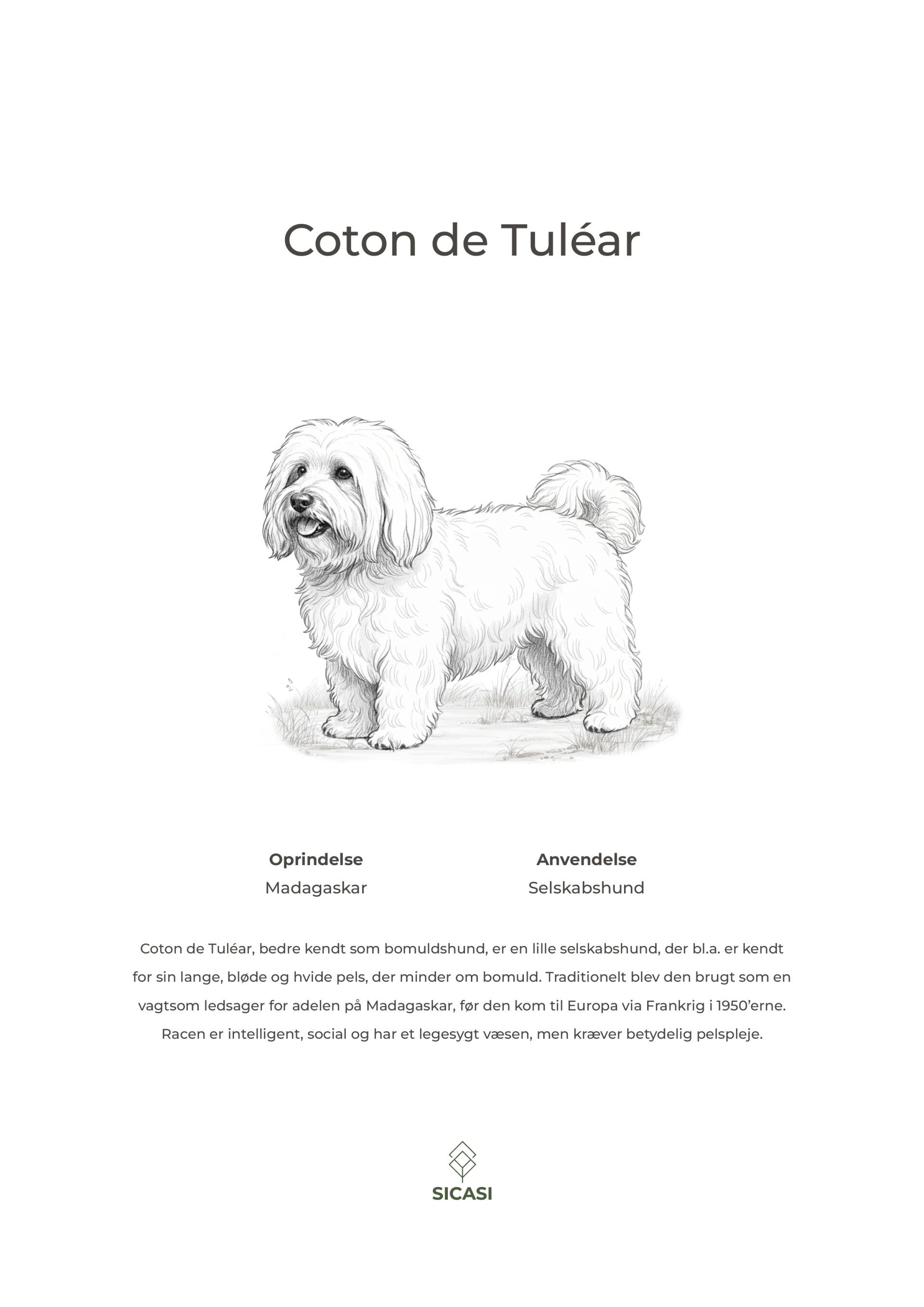 Plakat med hunderacen Coton de Tulear (Bomuldshund) inklusiv fakta og racebeskrivelse.